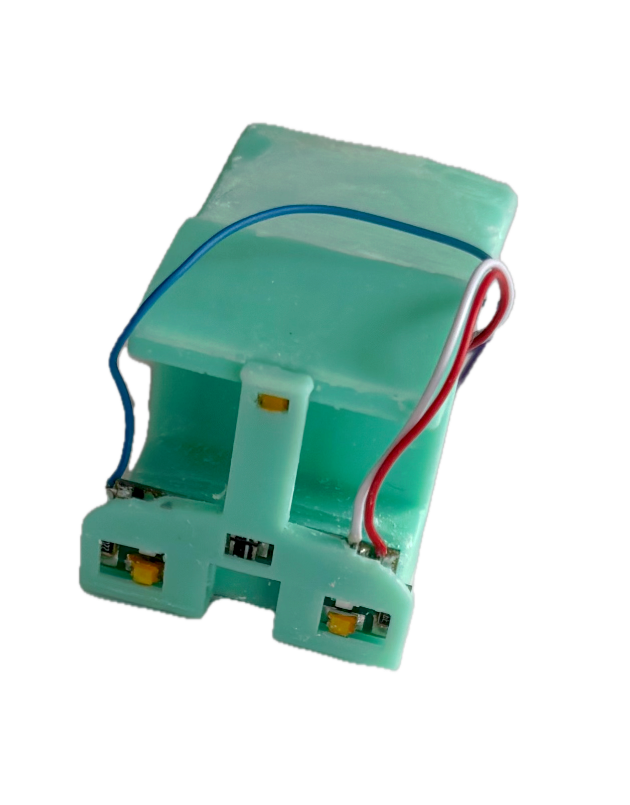 Auf vielfachen Wunsch hin bieten wir den fertigen Steuerstand mit Spitzenlicht und Konstantstromquelle als anschlussfertigen Baustein an. Einkleben, beide Litzen mit der Gleisspannung verbinden - fertig